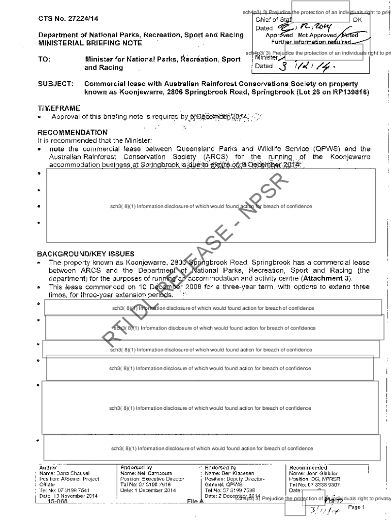 Sch4p3(3) Prejudice the protection of an individual right to private No. 27224/14 Department of National Parks, Recreation, Sport and Racing MINISTERIAL BRIEFING NOTEsch4p3(3) Prejudice the protection