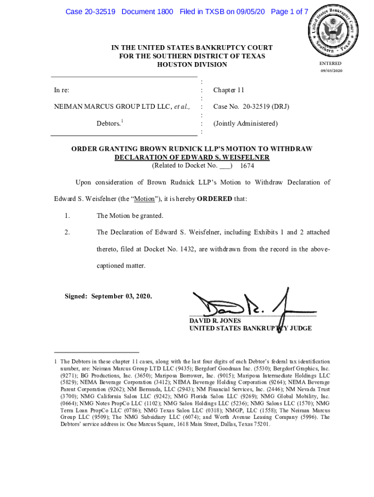 Case 2032519 Document 1800 Filed in TSB on 09/05/20-Page 1 of 7IN THE UNITED STATES BANKRUPTCY COURT FOR THE SOUTHERN DISTRICT OF TEXAS HOUSTON DIVISION In re: NEWMAN MARCUS GROUP LTD LLC, et al.,