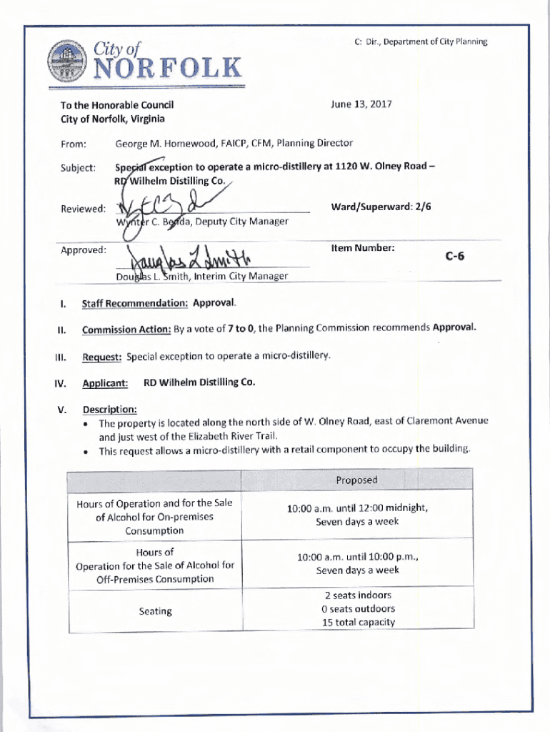 C: Dir., Department of City PlanningCity of NORFOLK June 13, 2017To the Honorable Council City of Norfolk, Virginia From:George M. Homewood, FICP, CFM, Planning DirectorSubject:exception to operate