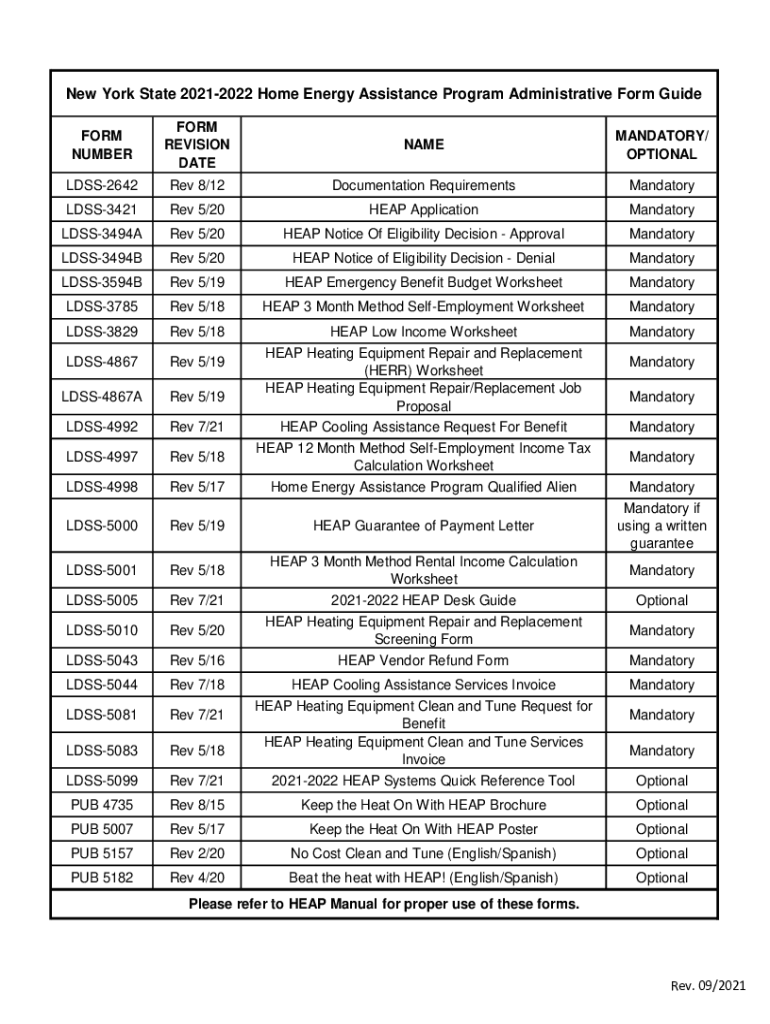 New York State 20212022 Home Energy Assistance Program Administrative Form Guide FORM OUTPERFORM REVISION DATENAMEMANDATORY/ OPTIONALLDSS2642Rev 8/12Documentation RequirementsMandatoryLDSS3421Rev