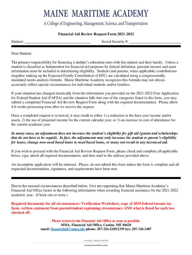 Financial Aid Review Request Form 20212022 Student:Social Security #:Dear Student: The primary responsibility for financing a students' education rests with the student and their family. Unless a