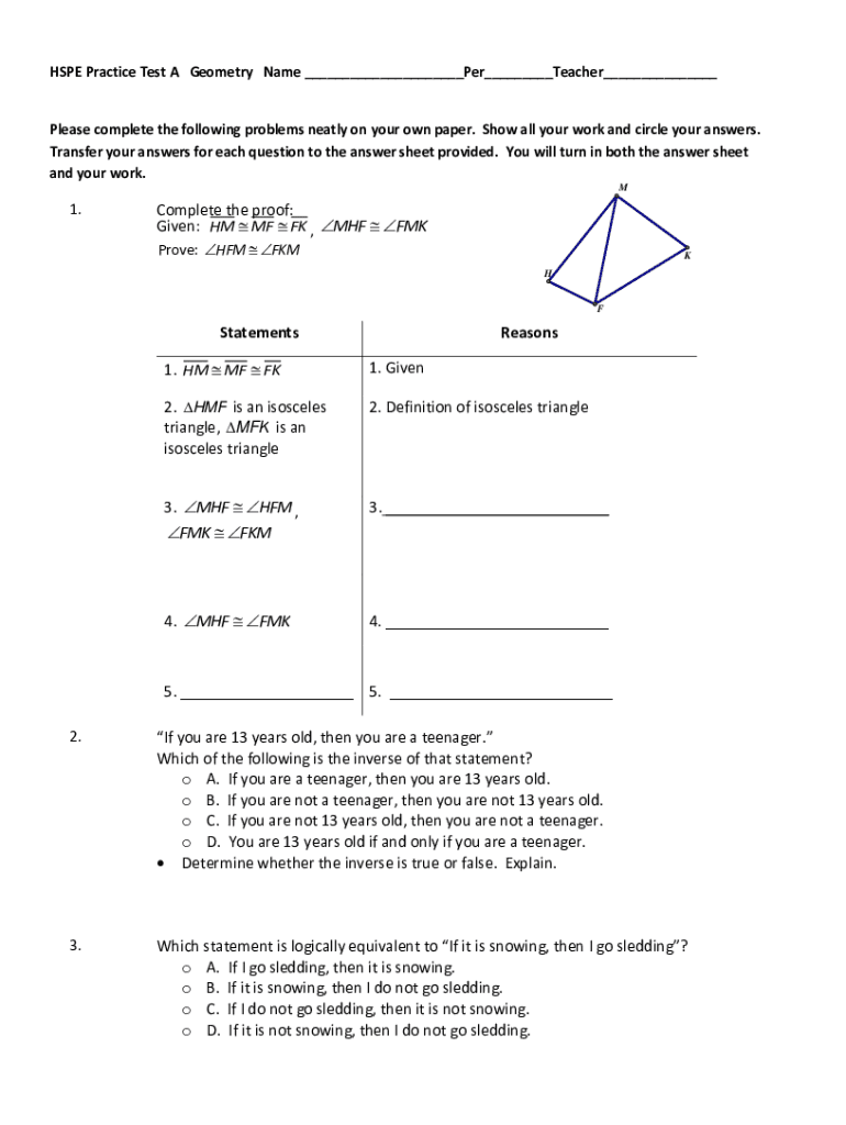 HOPE Practice Test A Geometry Name Per Teacher Please complete the following problems neatly on your own paper. Show all your work and circle your answers. Transfer your answers for each question