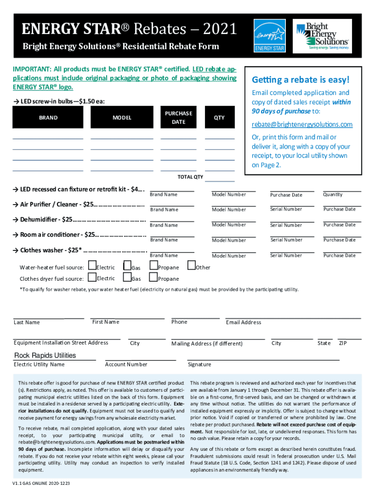 ENERGY STAR Rebates 2021Bright Energy Solutions 2020 Rebates Residential Rebate Form Bright Energy Solutions ENERGY STARIMPORTANT: All products must be ENERGY STAR certified. LED rebate applications