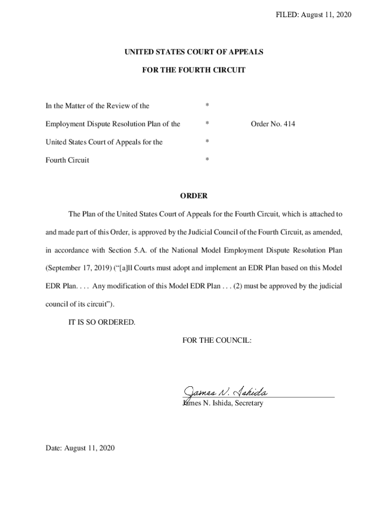 FILED: August 11, 2020UNITED STATES COURT OF APPEALS FOR THE FOURTH Circuiting the Matter of the Review of the×Employment Dispute Resolution Plan of the×United States Court of Appeals for the×Fourth