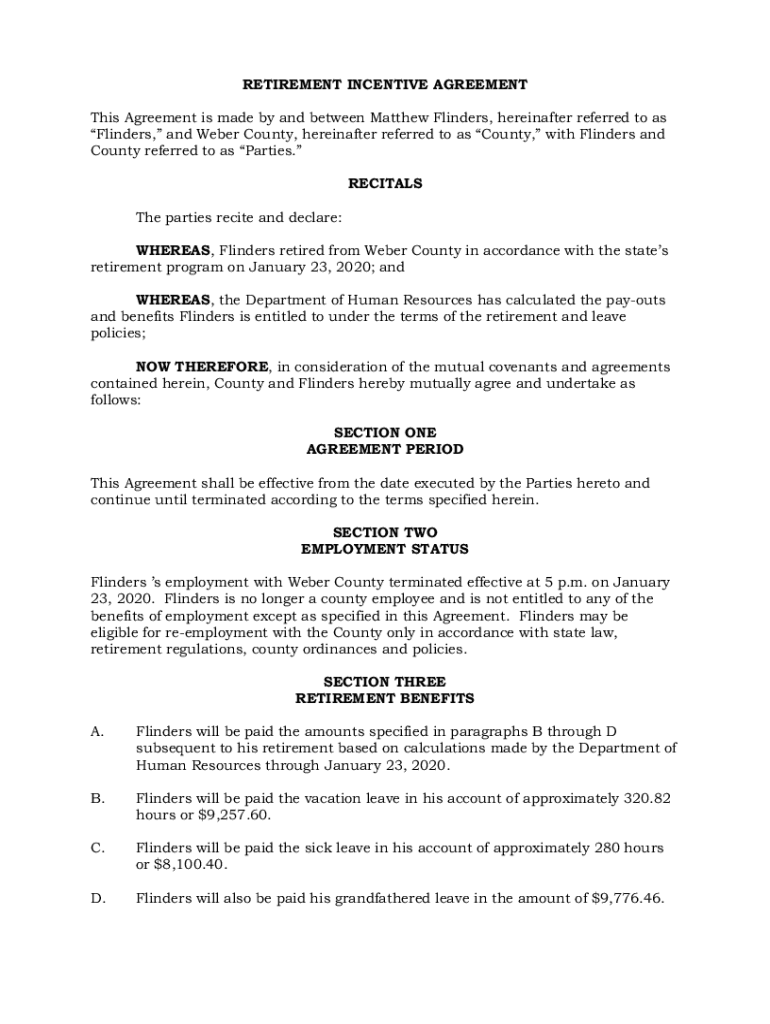 RETIREMENT INCENTIVE AGREEMENT This Agreement is made by and between Matthew Flinders, hereinafter referred to as Flinders, and Weber County, hereinafter referred to as County, with Flinders and County
