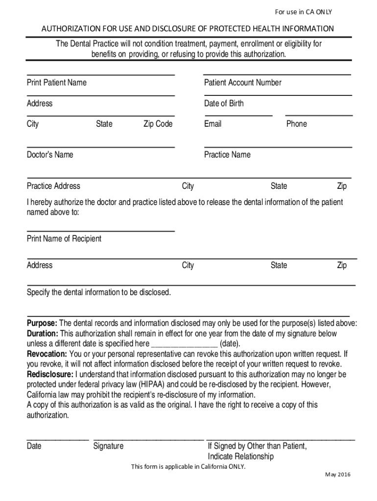 For use in CA ONLYAUTHORIZATION FOR USE AND DISCLOSURE OF PROTECTED HEALTH INFORMATION The Dental Practice will not condition treatment, payment, enrollment or eligibility for benefits on providing,