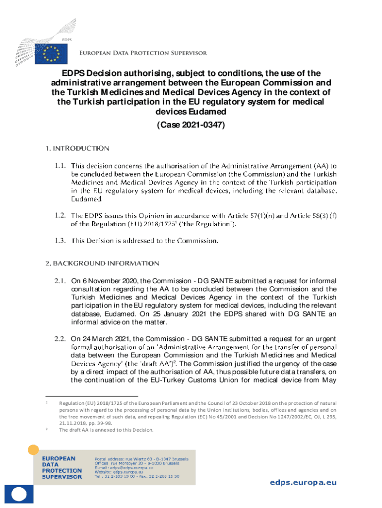 EDS Decision authorizing, subject to conditions, the use of the administrative arrangement between the European Commission and the Turkish Medicines and Medical. Devices Agency in the context of the