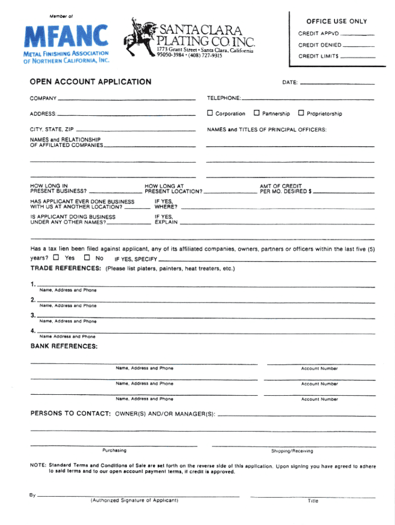 Member office USE OnlyFans SANTA CLARA PLATING CO. INC. 1773 Grant Street Santa Clara, CaliforniaMETAL FINISHING ASSOCIATION Of NORTHERN CALIFORNIA, INC.CREDIT AP PVD CREDIT DENIED950503984 (408)
