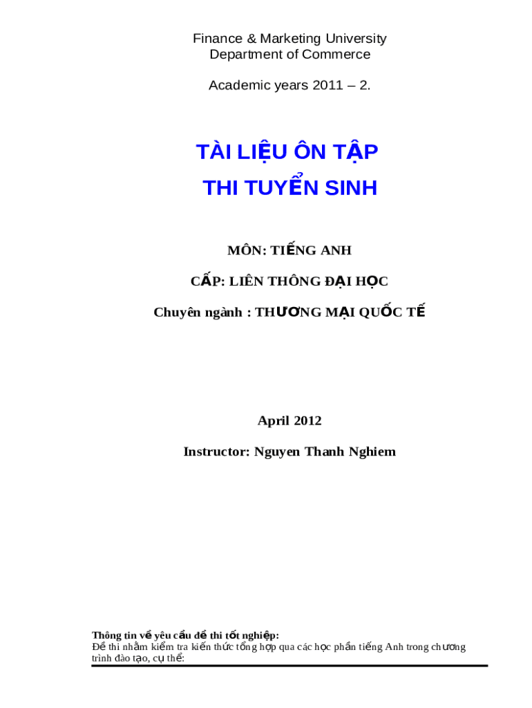 Finance & Marketing University Department of Commerce Academic years 2011 2.TI LIU N TP THE TURN SING MN: TING ANH CP: LIN THING I HC Churn NGN : THING MI QUO April 2012 Instructor: Nguyen Thanh NghiemThng