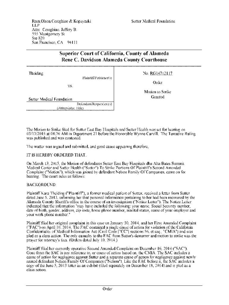 Ram, Olson, Barfing & Korzybski LLP Attn: Barfing, Jeffery B. 555 Montgomery St. Ste 820 San Francisco, CA 94111Sutter Medical Foundation Superior Court of California, County of Alameda Rene C. Davidson
