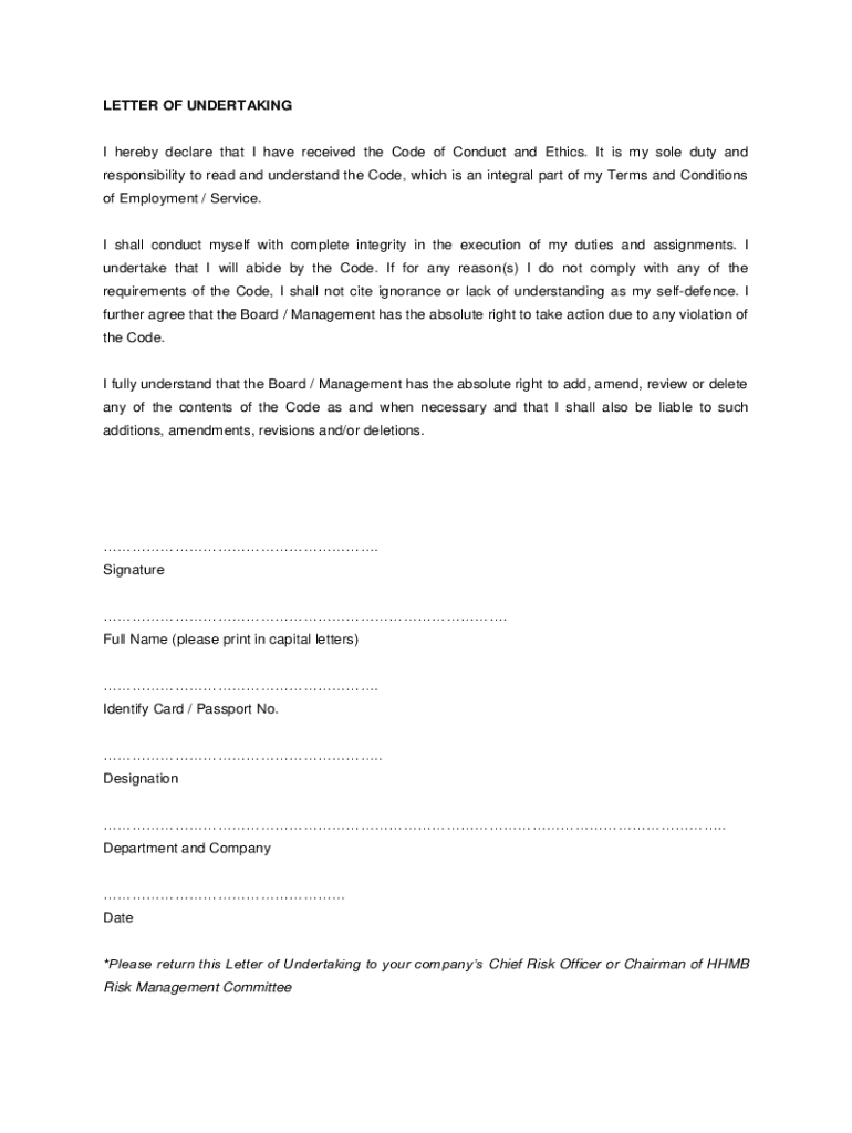 LETTER OF UNDERTAKING hereby declare that I have received the Code of Conduct and Ethics. It is my sole duty and responsibility to read and understand the Code, which is an integral part of my Terms