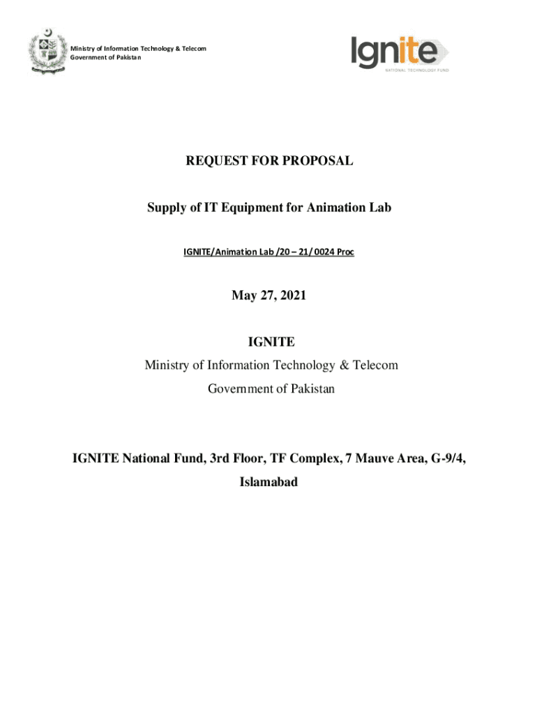 Ministry of Information Technology & Telecom Government of PakistanREQUEST FOR PROPOSALSupply of IT Equipment for Animation Lab IGNITE/Animation Lab /20 21/ 0024 Process 27, 2021IGNITE Ministry of