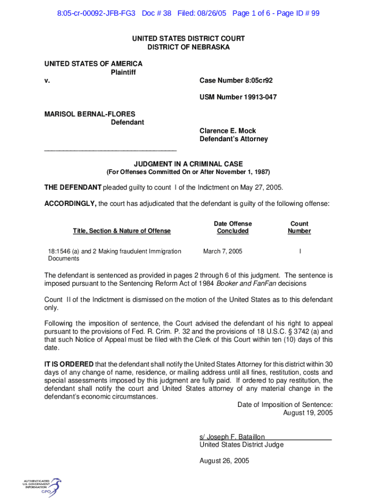 8:05cr00092JFBFG3 Doc # 38 Filed: 08/26/05-Page 1 of 6-Page ID # 99 UNITED STATES DISTRICT COURT DISTRICT OF NEBRASKA UNITED STATES OF AMERICA Plaintiff v. Case Number 8:05cr92 US Number 19913047MARISOL