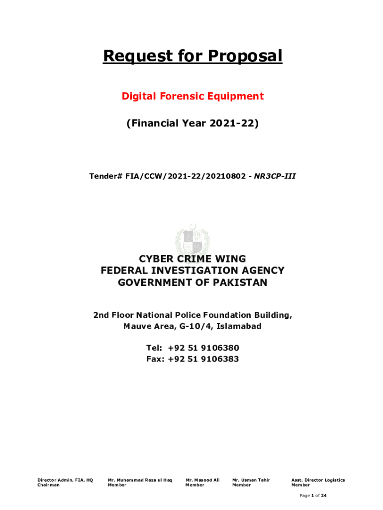 Request for Proposal Digital Forensic Equipment (Financial Year 202122)Tender# FIA/CCW/202122/20210802 NR3CPIIICYBER CRIME WING FEDERAL INVESTIGATION AGENCY GOVERNMENT OF PAKISTAN 2nd Floor National