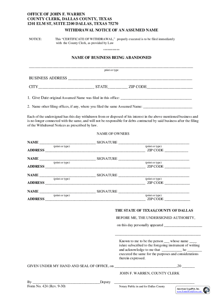 OFFICE OF JOHN F. WARREN COUNTY CLERK, DALLAS COUNTY, TEXAS 1201 ELM ST, SUITE 2200 DALLAS, TEXAS 75270 WITHDRAWAL NOTICE OF AN ASSUMED NAME NOTICE:This CERTIFICATE OF WITHDRAWAL, properly executed