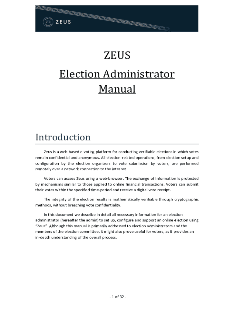 ZEUS Election Administrator ManualIntroduction Zeus is a web base devoting platform for conducting verifiable elections in which votes remain confidential and anonymous. All election related operations,