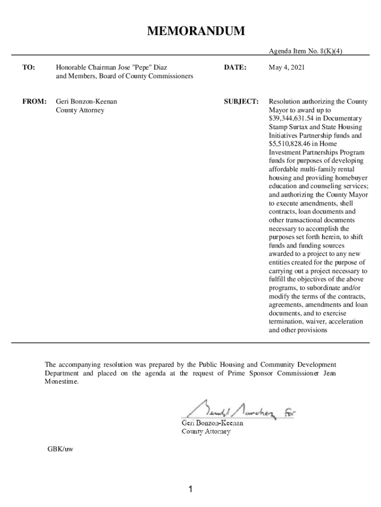 MEMORANDUM Agenda Item No. 8(K)(4) TO:Honorable Chairman Jose Pepe Diaz and Members, Board of County CommissionersDATE:May 4, 2021FROM:Germ BonzonKeenan County AttorneySUBJECT:Resolution authorizing