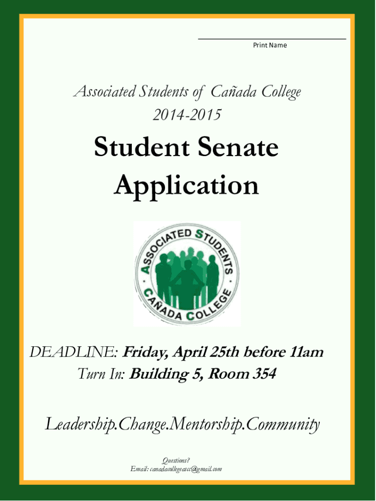 Print NameAssociated Students of Canada College 20142015Student Senate ApplicationDEADLINE: Friday, April 25th before 11am Turn In: Building 5, Room 354Leadership. Change. Mentorship. Community Questions?