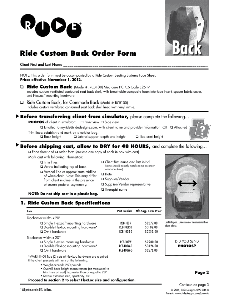 Ride Custom Back Order FormBackClient First and Last Name NOTE: This order form must be accompanied by a Ride Custom Seating Systems Face Sheet. Prices effective November 1, 2012. Ride Custom Back(Model