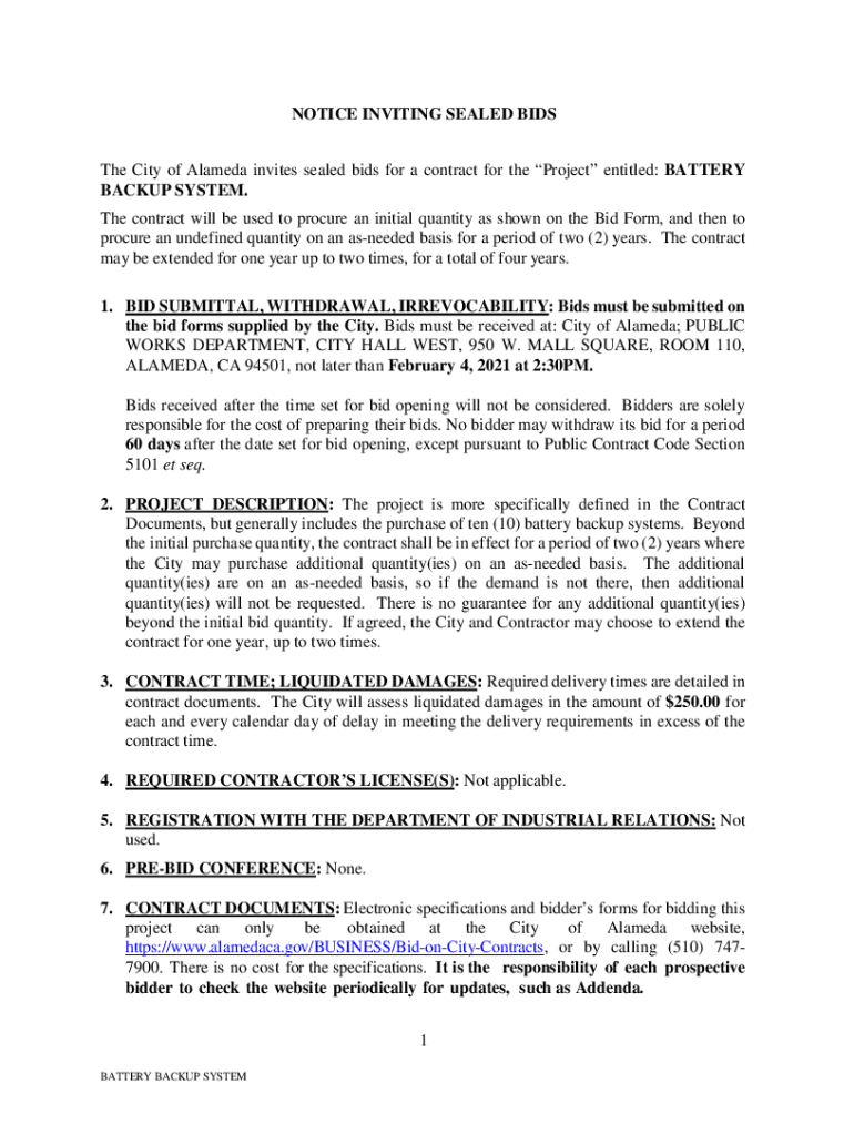 NOTICE INVITING SEALED BIDS The City of Alameda invites sealed bids for a contract for the Project entitled: BATTERY BACKUP SYSTEM. The contract will be used to procure an initial quantity as shown
