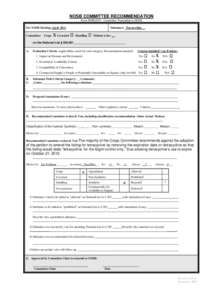 NOSE COMMITTEE RECOMMENDATION Form NOPLIST1. Committee Transmittal to NOSE For NOSE Meeting: April 2011 Committee: Crops Livestock Substance: __ HandlingPetition is for: __on the National List 205.601___