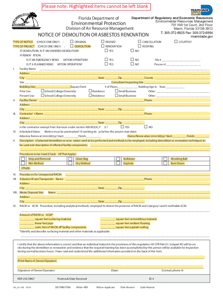 Reset Formulas note: Highlighted items cannot be left blank Florida Department notice Department of Regulatory and Economic Resources Environmental Resources Management Environmental Protection 701