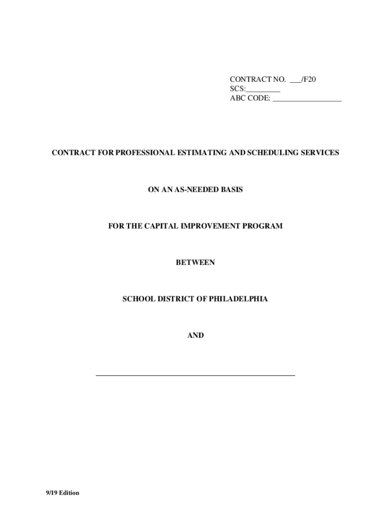 CONTRACT NO. /F20 SCS: ABC CODE: CONTRACT FOR PROFESSIONAL ESTIMATING AND SCHEDULING SERVICE SON AN NEEDED BASIS THE CAPITAL IMPROVEMENT PROGRAMBETWEENSCHOOL DISTRICT OF PHILADELPHIA 9/19 EditionTABLE