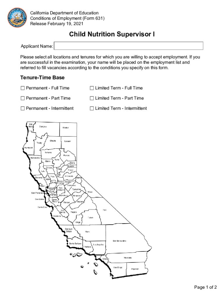 California Department of Education Conditions of Employment (Form 631) Release February 19, 2021Child Nutrition Supervisor I Applicant Name: Please select all locations and tenures for which you are