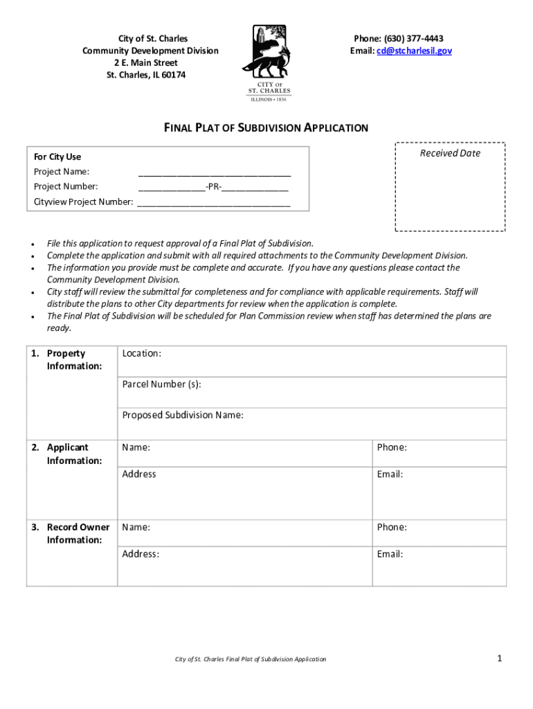 City of St. Charles Community Development Division 2 E. Main Street St. Charles, IL 60174Phone: (630) 3774443 Email: CD stcharlesil. Final PLAT OF SUBDIVISION APPLICATION Received Dater City Use Project