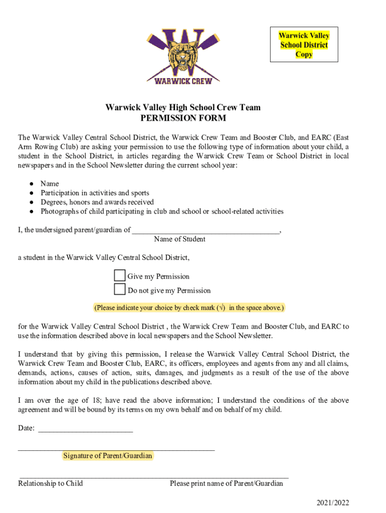 Warwick Valley High School Crew Team PERMISSION FORM The Warwick Valley Central School District, the Warwick Crew Team and Booster Club, and EARL (East Arm Rowing Club) are asking your permission
