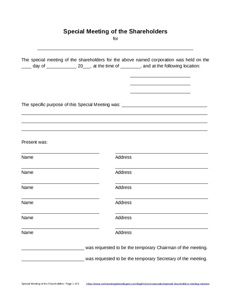 Special Meeting of the Shareholders for The special meeting of the shareholders for the above named corporation was held on the day of 20, at the time of, and at the following location: The specific