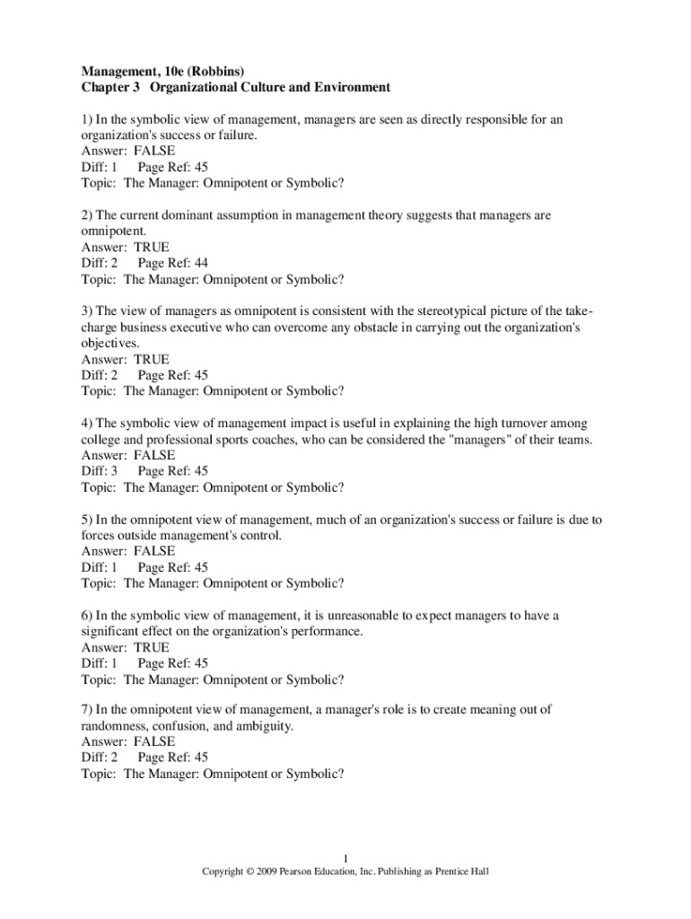 Management, 10e (Robbins) Chapter 3 Organizational Culture and Environment 1) In the symbolic view of management, managers are seen as directly responsible for an organization\'s success or failure.