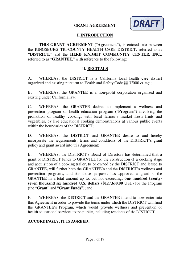GRANT AGREEMENT I. INTRODUCTION THIS GRANT AGREEMENT (Agreement), is entered into between the GINSBURG COUNTY HEALTH CARE DISTRICT, referred to as DISTRICT, and the HERB KNIGHT COMMUNITY CENTER, INC.,