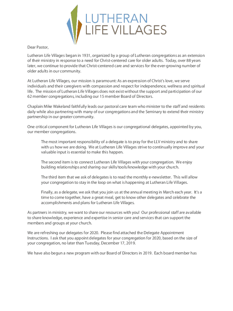 Dear Pastor, Lutheran Life Villages began in 1931, organized by a group of Lutheran congregations as an extension of their ministry in response to a need for Christ centered care for older adults.
