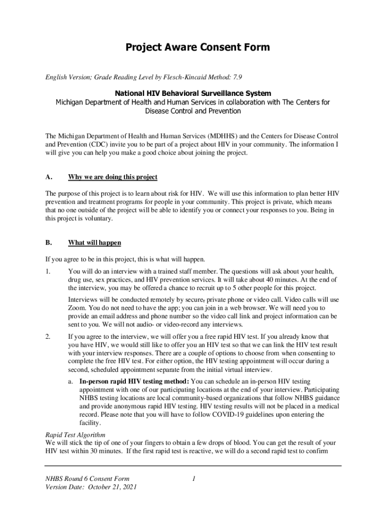 Project Aware Consent Form English Version; Grade Reading Level by FleschKincaid Method: 7.9 National HIV Behavioral Surveillance System Michigan Department of Health and Human Services in collaboration