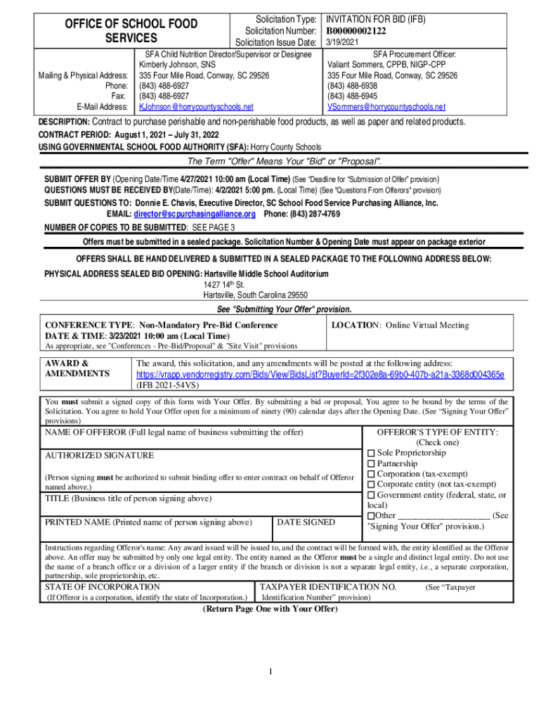 Solicitation Type: INVITATION FOR BID (IF) Solicitation Number: B00000002122 Solicitation Issue Date: 3/19/2021OFFICE OF SCHOOL FOOD SERVICES Mailing & Physical Address: Phone: Fax: Email Address:SFA
