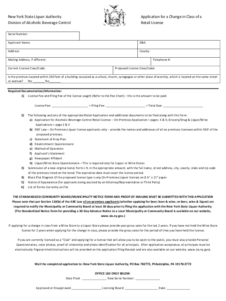 Get the free New York State Liquor Authority Application for a Change in Class of ... - sla ny