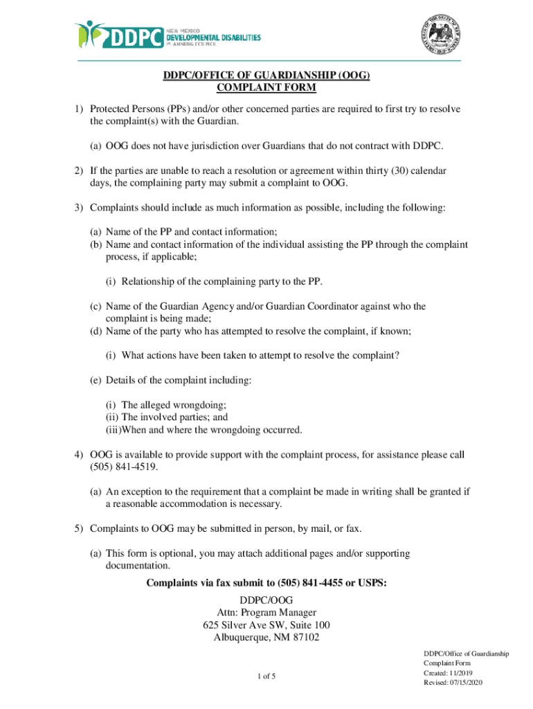 DDC/OFFICE OF GUARDIANSHIP (DOG) COMPLAINT FORM 1) Protected Persons (PPS) and/or other concerned parties are required to first try to resolve the complaint(s) with the Guardian. (a) DOG does not