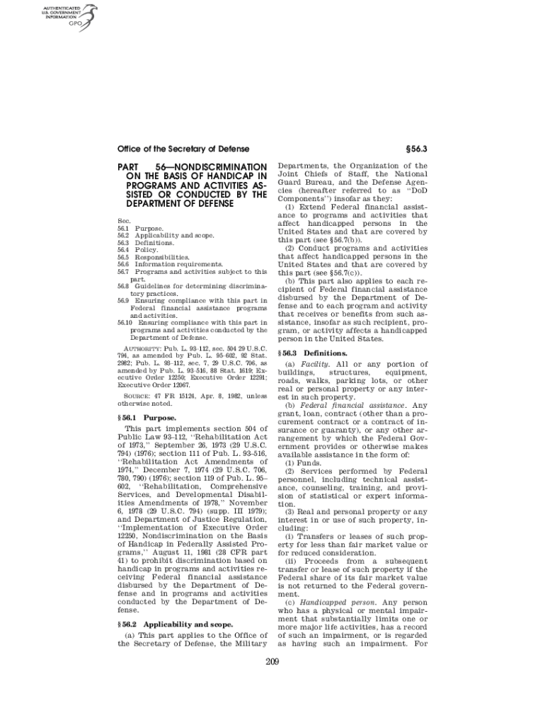Office of the Secretary of Defense 56.3PART 56NONDISCRIMINATION ON THE BASIS OF HANDICAP IN PROGRAMS AND ACTIVITIES ASSISTED OR CONDUCTED BY THE DEPARTMENT OF DEFENSE Sec. 56.1 Purpose. 56.2 Applicability