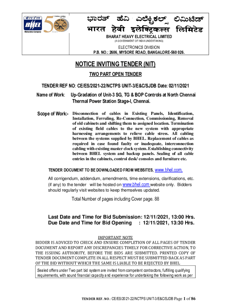 BHARAT HEAVY ELECTRICAL LIMITED (A GOVERNMENT OF INDIA UNDERTAKING)ELECTRONICS DIVISION P.B. NO.: 2606, MYSORE ROAD, BANGALORE560 026.NOTICE INVITING TENDER (NIT) TWO PART OPEN TENDER REF NO: CE/ES/202122/NC