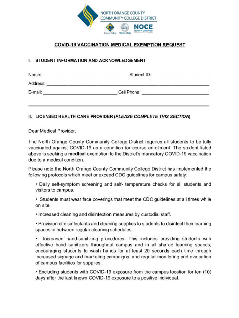 Students who have medical conditions that prevent them from meeting certain health requirements set by the district are required to file a nocccd medical exemption request.
