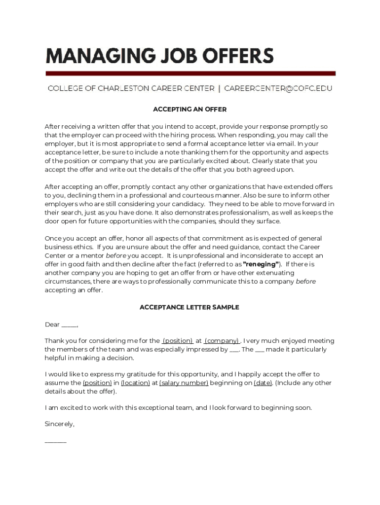 ACCEPTING AN OFFER After receiving a written offer that you intend to accept, provide your response promptly so that the employer can proceed with the hiring process. When responding, you may call