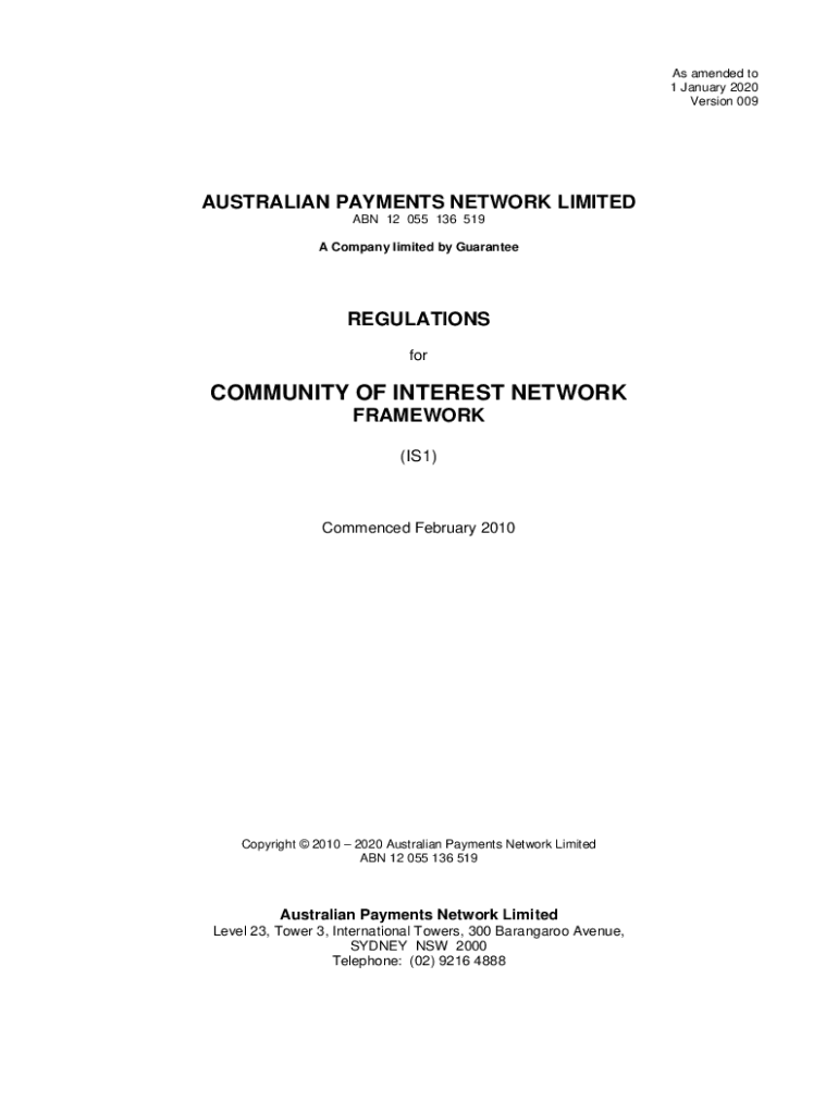 As amended to 1 January 2020 Version 009AUSTRALIAN PAYMENTS NETWORK LIMITED ABN 12 055 136 519 A Company limited by GuaranteeREGULATIONS community OF INTEREST NETWORK FRAMEWORK (IS1)Commenced February