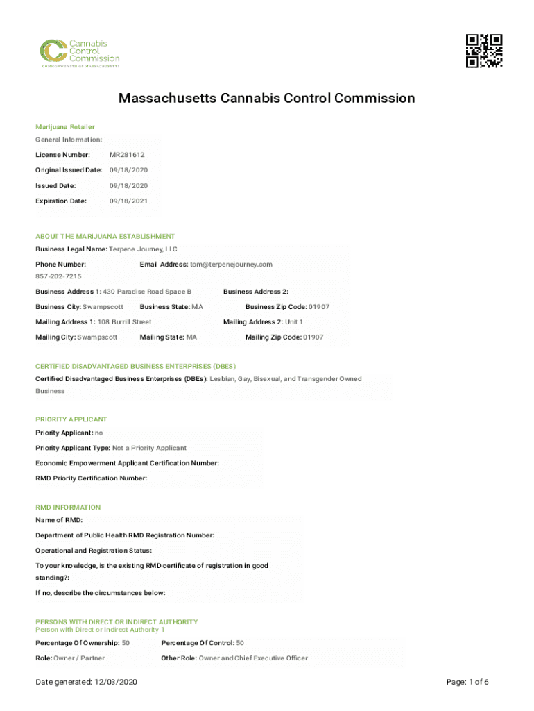Massachusetts Cannabis Control Commission Marijuana Retailer General Information: License Number:MR281612Original Issued Date: 09/18/2020 Issued Date:09/18/2020Expiration Date:09/18/2021ABOUT THE