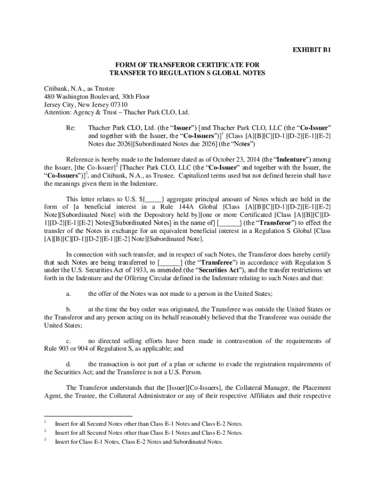 EXHIBIT B1 FORM OF TRANSFEROR CERTIFICATE FOR TRANSFER TO REGULATION S GLOBAL NOTES Citibank, N.A., as Trustee 480 Washington Boulevard, 30th Floor Jersey City, New Jersey 07310 Attention: Agency