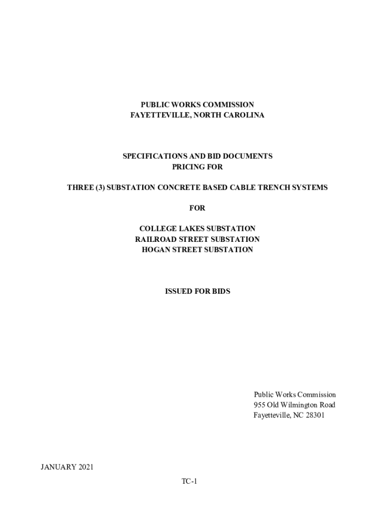 PUBLIC WORKS COMMISSION FAYETTEVILLE, NORTH CAROLINASPECIFICATIONS AND BID DOCUMENTS PRICING FOR THREE (3) SUBSTATION CONCRETE BASED CABLE TRENCH SYSTEMS FOR COLLEGE LAKES SUBSTATION RAILROAD STREET