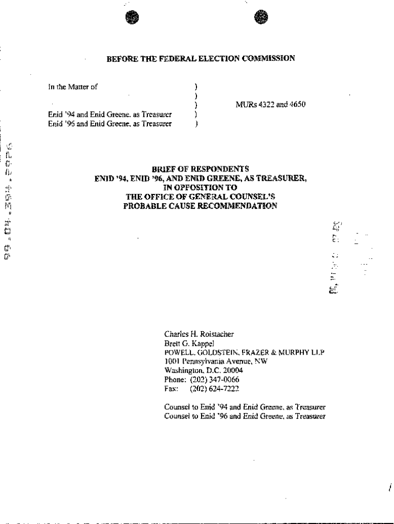 1IIBEFORE THE FEDERAL ELECTION C O I S I N1In the Matter of)Enid '! I4 and Enid Greene. As Treasurer Enid '96 and Enid Greene. As Treasurer1 1 1MURs 4322 MD 4650BRIEF OF RESPONDENTS ENID '94, ENID