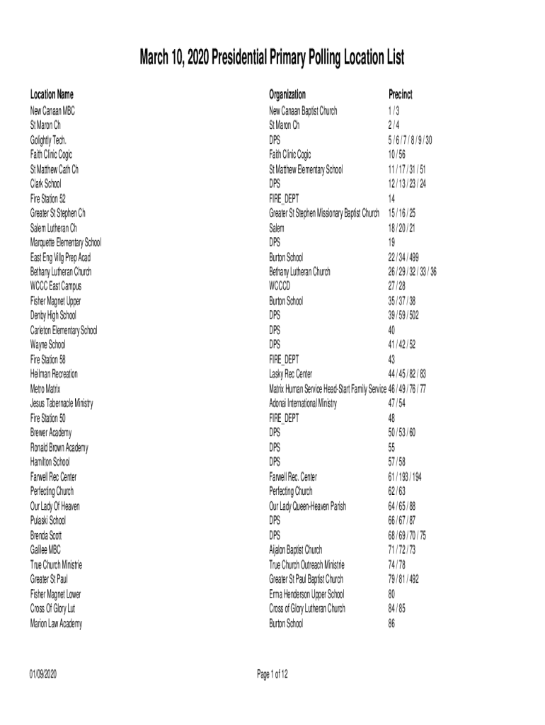 March 10, 2020, Presidential Primary Polling Location List Location NameOrganizationNew Canaan MBC St Aaron Ch Go lightly Tech. Faith Clinic Comic St Matthew Path Ch Clark School Fire Station 52 Greater