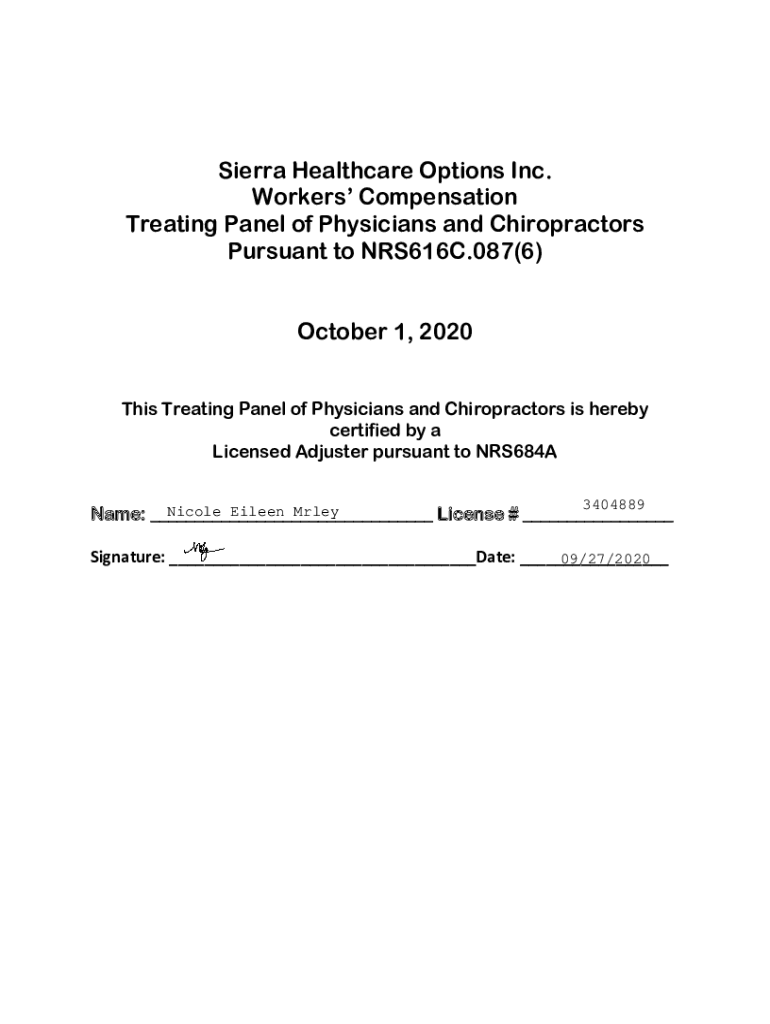 Sierra Healthcare Options Inc. Workers Compensation Treating Panel of Physicians and Chiropractors Pursuant to NRS616C.087(6) October 1, 2020, This Treating Panel of Physicians and Chiropractors is