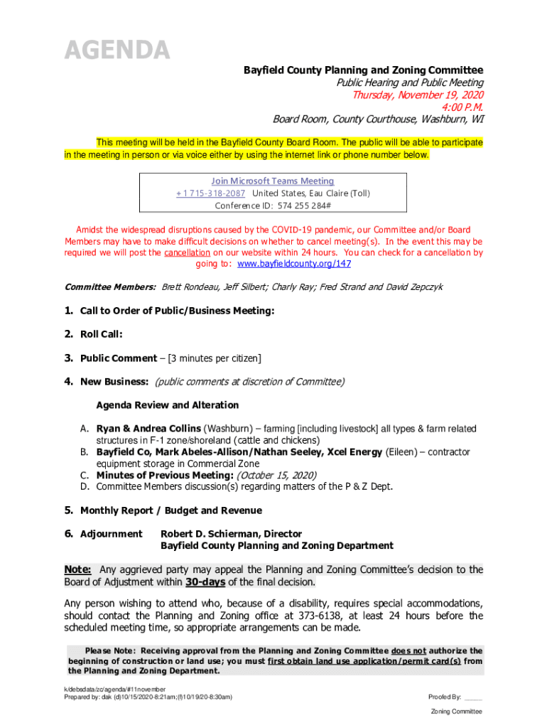 AGENDABayfield County Planning and Zoning CommitteePublic Hearing and Public Meeting Thursday, November 19, 2020 4:00 P.M. Board Room, County Courthouse, Washburn, Within meeting will be held in the
